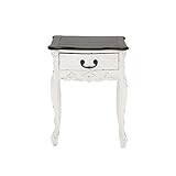 24"H x 19"W Shabby Chic style antique white carved mahogany nightstand, natural wood top with one drawer, rustic metal pull. This product is manufactured in Indonesia.