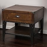 Made with wood and complemented with iron accents.This wood end table will complete any room you choose to incorporate it in.Store items in the top drawer for safekeeping or even place items on the bottom shelf for easy access.Includes: One (1) end table, Weight: 64-pounds.Assembly Required. Dimensions: 22.25 high x 23.50 wide x 23.50 deep inches.