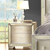 A dazzling bedside companion, this Furniture of America Andriani 2 Drawer Nightstand is bordered by antique mirror panels that reflect its vintage Hollywood glamor. A stunning silver gray finish and jewelry-inspired metal ring pulls add polish to this sophisticated nightstand. It's well-crafted of solid wood and veneers. About Furniture of America Based in California, Furniture of America has established itself as a premier provider of fine home furnishings. The people behind Furniture of America brand are moved by passion, hard work and persistence. They are always striving to design the latest piece, keeping in mind their mission to make quality furniture available to urban-minded shoppers, without compromising the packaging integrity. Furniture of America offers unique, coordinated and affordably designed furniture; they are a one-step resource for high-quality furniture with secure and professional packaging in the furniture industry. Dimensions: 30W x 17.5D x 29.25H in.. Solid wood, wood veneer, metal, and glass. Glamorous silver gray finish. 2 full extension drawers with metal side glides. Antique-inspired ring pulls. Felt-lined top drawer. Soft-close drawers. Mirrored panels on edges. Curved bracket feet.