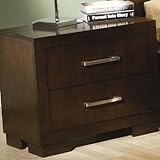 Jessica Nightstand by Coaster. This modern style nightstand, crafted from select veneers and solid wood on a light cappuccino finish, will definitely highlight your bedroom decor. The Nightstand features rectangular shape and offers two drawers for storage space. It is adorned with cast metal hardware in a simulated bright chrome color finish. The drawers have full extension dove tailing.