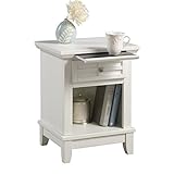 The arts and crafts night stand. Embellishes typical mission styling with a framed drawer showcasing raised wood, lattice moldings and slightly flared legs. Comes in a white finish over hardwood solids and engineered woods with square, brushed nickel hardware. This night stand's simplistic yet detailed design makes it an ideal piece for any bedroom setting. The top of the hidden pull-out tray features a scratch and stain resistant finish. Easy to assemble. Measures 18-inch width by 16-inch depth by 24-inch height.