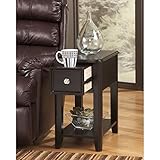 This narrow nightstand table gussy up your armchair, recliner or bedside with this glossy Ashley end table. Constructed with strong wood that is aesthetically pleasing, the end table's black finish is visually compact and contrasts tastefully. You can set easily this end table in a bathroom corner to provide additional storage for your knickknacks or put a lamp on it to bring both light and warmth to small spaces. This nightstand has a single storage drawer and a shelf above. The shelf provides room for your books and reading glasses. Assembly required. Dimensions: 23 high x 13 wide x 22 deep inches.
