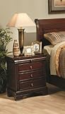 Complement your bed with this traditionally styled nightstand. This beautiful nightstand features carved bracket feet with burnished hardware in a deep mahogany stain finish. It has three spacious storage drawers to keep your bedside essentials close at hand, plus a pull out shelf for bed time beverages. Keep all your bed time accessories, books or magazines neatly organized in this nightstand.One Pull Out ShelfConstructed from sturdy woodClassic moldingDeep Mahogany stainThree DrawersLength 17Width 24Style TraditionalType SleighHeight 27Finish Dark WoodColor Brown