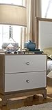 The two-tone finish and generous drawers of this Progressive Furniture Hashtag FUN 2 Drawer Nightstand make it a smart bedside companion. This nightstand boasts clean lines and a hand-applied two-tone marshmallow and latte finish. The two drawers sport French and English dovetail construction, full extension guides, and simple satin nickel knobs. A plinth style base enhances the contemporary feel of this nightstand. About Progressive Furniture Established in 1985 in Hickory, North Carolina by several investors who had a vision to shape a successful furniture company, Progressive Furniture has thrived ever since. They began manufacturing and distributing occasional tables and naturally started creating bedroom furniture. By 2001, Progressive furniture had become a major force in U.S. furniture manufacturing covering the likes of several markets including: occasional tables, bedroom furniture, entertainment centers, and dining room furniture. Around that same time, Progressive Furniture was acquired by Sauder Woodworking and became a part of the Sauder family of companies. Together, they soon became the 7th largest furniture manufacturing company in the world. Today, Sauder and Progressive operate facilities in Ohio, North Carolina, California, Mexico, and China, including additional partnerships with factories in Indonesia, Vietnam, and Hong Kong. Progressive remains at the top of the industry and has been a trusted manufacturer for over 25 years. Dimensions: 24W x 16D x 26H in.. Durable wood construction. Hand-applied marshmallow and latte finish. 2 full-extension inset drawers. French and English dovetail drawers. Satin nickel finished knobs. Plinth base.